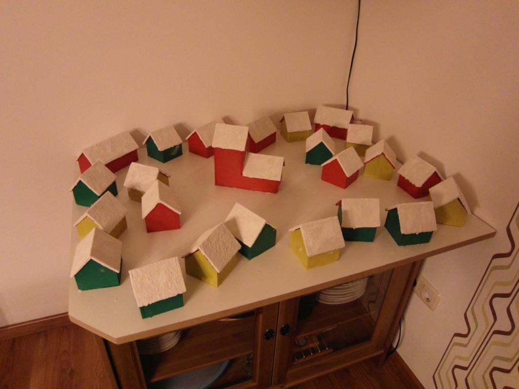 Dieses Jahr habe ich einen Adventskalender selber gebastelt. Von dem Sandkasten Projekt “Wikinger Schiff” hatte ich noch einiges an Sperrholz über, aus dem ich dann kleine Häuschen mit einer Grundfläche von (19x) 8 cm x 8 cm (3x) 8 cm x 10 cm (1x) 8 cm x 12 cm und eine Kirche mit der Grundfläche von 8 cm x 16 cm. Die Häuschen sind alle ca. 8 cm hoch, außer der Kirche, die ist ca. 12 cm hoch.